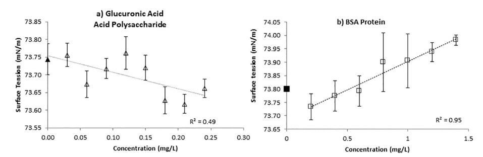 圖 5.a) 葡糖醛酸,一種酸性多糖,證明在低濃度下 SFT 降低。 b) 相反,BSA 蛋白在低 專(zhuān)注。 然而,BSA 在較高濃度下再次降低。 低濃度下 SFT 的這種增加可以通過(guò)水中 pH 值的降低來(lái)解釋 由 BSA 引起,圖 6。