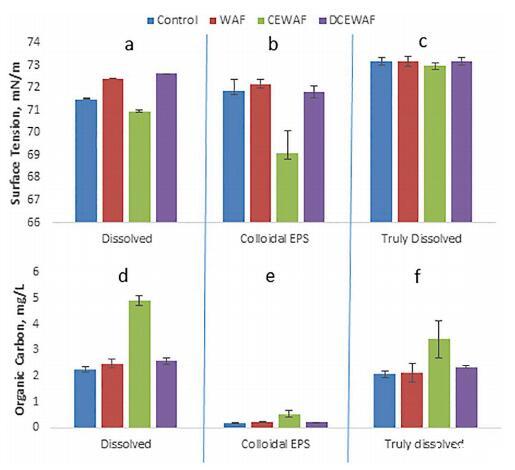 圖 2 中的有機(jī)碳表明大部分溶解的 部分,圖 2d,由低分子量碳組成,因?yàn)榭側(cè)芙獠糠?,圖 2f,幾乎等于 有機(jī)碳濃度中的溶解分?jǐn)?shù)。 膠體 餾分(圖 2e)表明超濾已去除了 85% 到 95% 的 溶解部分的有機(jī)碳。 這可能表明 5% 到 15% 的 CEWAF 可能保留在 EPS 膠體部分中, 表明 SFT 的降低(圖 2b)也受 Corexit 的影響 和 WAF。 然而,使用 SFT 與 Corexit 濃度數(shù)據(jù), 圖 4b,即使是 15% 的 Corexit 也無(wú)法解釋 在圖 1 的 CEWAF 處理中測(cè)量的 SFT 降低。