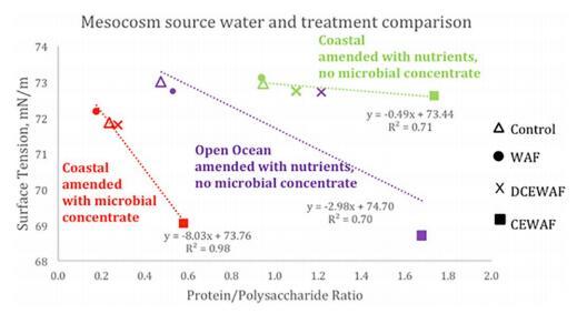 EPS 膠體溶液的 SFT 與 蛋白質(zhì)(更疏水)到多糖(更親水) 集中度,可以作為整體的相對(duì)度量 膠體部分的疏水性。 此外,圖1中的數(shù)據(jù) 意味著石油和/或 Corexit 的存在導(dǎo)致增強(qiáng) EPS 膠體的蛋白質(zhì):多糖比率,但降低了 膠體部分的 SFT。 CEWAF 中蛋白質(zhì)含量較高 處理對(duì)應(yīng)的細(xì)菌計(jì)數(shù)高于其他處理 治療(Kamalanathan 等人,2018 年;Doyle 等人,2018 年)。 DCEWAF 還具有更高的蛋白質(zhì)含量和更高的蛋白質(zhì):多糖 比 WAF 和對(duì)照處理。 值得注意的是,當(dāng) 與不同的中宇宙實(shí)驗(yàn)相比,開(kāi)闊的海洋中宇宙的油濃度高兩倍,相對(duì) DCEWAF 處理中的 Corexit 含量較高,即它們僅 ~6.3 倍稀釋的 CEWAF,而 DCEWAF 處理來(lái)自 用微生物濃縮物修正的沿海水域約 15 倍 稀釋的 CEWAF 和經(jīng)過(guò)修正的營(yíng)養(yǎng)物質(zhì)的沿海水域是 ~ 10 倍稀釋的 DCEWAF(表 1)。 因此,趨勢(shì)線(xiàn)的斜率 可能受到 DCEWAF 中 Corexit 數(shù)量的影響,并且 CEWAF 處理 SFT 和蛋白質(zhì):多糖 比率。 由于其表面活性劑特性,Corexit 降低了 SFT,但它 還增強(qiáng)了蛋白質(zhì)的產(chǎn)生,導(dǎo)致比對(duì)照和 WAF 處理更高的蛋白質(zhì):多糖比率。 這 相對(duì) SFT 和蛋白質(zhì):對(duì)照和 WAF 的多糖位置 可能是由膠體和海水的組成和濃度的微小差異產(chǎn)生的。