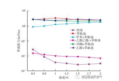 圖4為原油、萃取油以及萃取油分別添加濃度為1%的甲苯洗脫物、乙酸乙酯洗脫物、丙酮洗脫物、乙醇洗脫物配成的模擬油與0.5%,0.8%,1%,1.2%,1.5%,1.7%,2%這七種濃度Na2CO3的界面張力??梢钥闯?,乙酸乙酯洗脫組分與堿的界面張力最低。隨著Na2CO3濃度變大,界面張力也持續(xù)降低,當(dāng)Na2CO3濃度達(dá)到2%時(shí),其界面張力達(dá)到10-3 mN/m。孫景倫等研究了復(fù)合驅(qū)油體系中堿與原油的相互作用,發(fā)現(xiàn)Na2CO3更易于環(huán)烷酸以及苯環(huán)和不飽和酸部分反應(yīng);與飽和酸相比,環(huán)烷酸以及苯環(huán)和不飽和酸的界面活性更強(qiáng),導(dǎo)致界面張力更低。