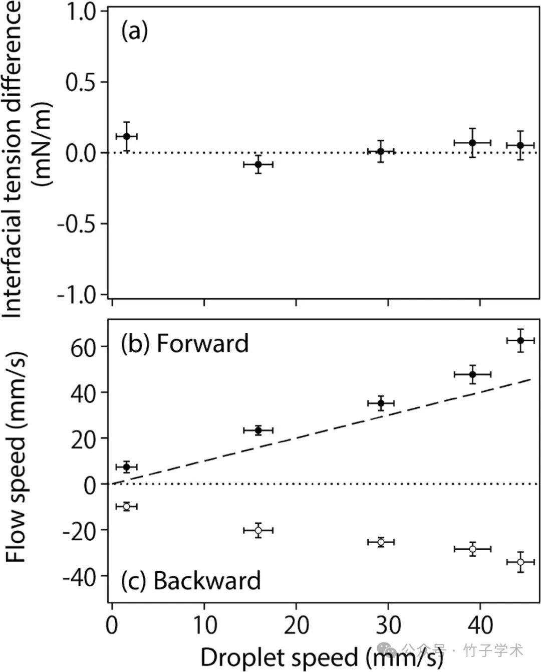 圖5是液滴速度與(a)液滴前后部之間的界面張力差、(b)向前流動速度(實心圓圈)和(c)向后流動速度(空心圓圈)的關(guān)系。水平虛線表示零,虛線表示液滴速度與前進流速相同時的情況。