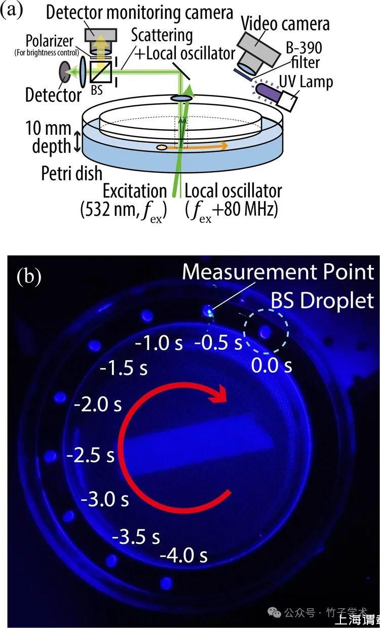 圖1(a)用于研究自驅(qū)動液滴和QELS測量的實驗安排概述。BS代表分束器,其透射率/反射率之比為90:10。(b)60 mM SDS溶液上移動的自驅(qū)動液滴和測量點的重疊熒光圖像。
