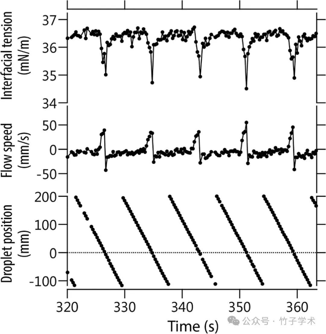 結(jié)果,當(dāng)液滴通過時間分辨測量的采樣位置時,觀察到界面張力的周期性減小以及向前和向后流動的速度的周期性增加。當(dāng)它們轉(zhuǎn)換為液滴位置的空間分布時,沒有觀察到液滴前后界面張力差對液滴速度的依賴性。另一方面,隨著液滴速度的增加,向前和向后流動的速度都增加。通過簡化模型對上述結(jié)果的分析,表明液滴前沿界面張力梯度驅(qū)動的前向流動實際上在液滴單向自推進運動機制中發(fā)揮著重要作用。