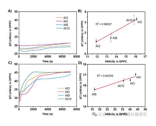 圖4、(A和C)在亞相中注射抗菌肽后DPPC和DPPG脂質(zhì)單層的表面壓力變化。(B和D)分別在注射抗菌肽(AMP)后DPPC和DPPG脂質(zhì)單層表面壓力的增加與DPPC和DPPG中AMP的螺旋度之間的相關(guān)性。注射抗菌肽后兩性離子DPPC脂質(zhì)單層表面壓力的增加非常小,而陰離子DPPG脂質(zhì)單層表面壓力的增加相當高。