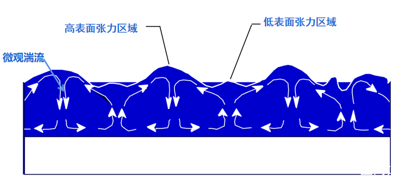 在液相涂層,在漆膜干燥過程中存在著微觀湍流。先干區(qū)域往往更多表現(xiàn)為樹脂本身的表面張力,液相部分還是保持有機(jī)硅或者氟添加劑的表面張力。低表面張力的液態(tài)部分會(huì)有強(qiáng)烈的向高表面張力的區(qū)域遷移的傾向,這樣的效果累積起來就會(huì)容易出現(xiàn)橘皮或者波浪紋!