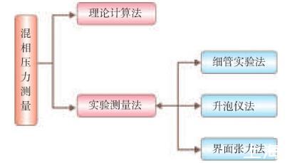目前測量混相壓力的方法如圖3所示。國內(nèi)外許多專家研究了確定最小混相壓力的方法,包括理論計算和實驗測定。但是,一般的理論計算精確度都不高,而實驗測定方法具有較高的可靠性。實驗測定方法包括細管實驗、升泡儀法及界面張力法等。其中,界面張力法是通過直接測定注氣相與地層原油間的界面張力來確定最小混相壓力,既能觀測到形成混相的狀態(tài),而且操作時間也較短。細管實驗法被認為是最可靠的測量最小混相壓力方法,但細管實驗也有局限性,不能模擬黏性指進、重力超覆等因素,實驗周期長,大約需要7~14天,且實驗工作量大。升泡儀法是直接觀察混相過程,測量周期短,1h可以完成測量,測量結(jié)果受人為因素影響嚴重。而界面張力法是通過直接測定注氣相與地層原油間的界面張力來確定最小混相壓力,既能觀測到形成混相的狀態(tài),而且操作時間也較短,僅需5~6h。