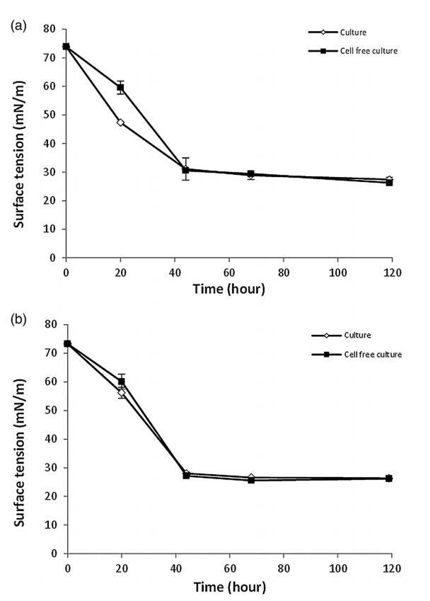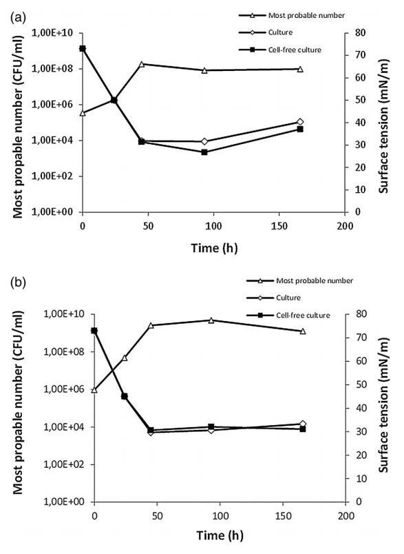 菌株紅球菌屬。 菌株 LF-13 和紅球菌屬。 大約 2 天后,菌株 LF-22 達到穩(wěn)定期(圖 1)。 LF-13 和 LF-22 的培養(yǎng)物表面張力的最低值分別為 31.8 和 29.3 mN m-1,當培養(yǎng)物達到穩(wěn)定期時(圖 1)。 無細胞制劑的值顯示出與培養(yǎng)物類似的降低,表明生物表面活性劑被釋放到培養(yǎng)基中。 從工業(yè)角度來看,將生物表面活性劑分泌到培養(yǎng)基中的分離物很有趣,因為這使得生物表面活性劑的純化過程更簡單。 [16,44,45]