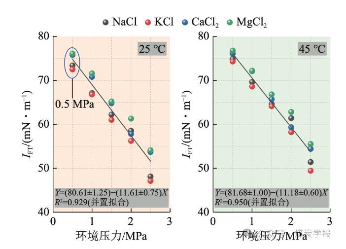 圖 4 不同離子溶液類(lèi)型條件下 CO2?純水界面張力變化情況(礦化度統(tǒng)一為 1.5%)