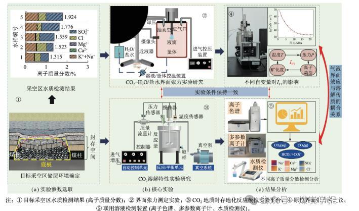 雖然前期探索CO2地下封存技術(shù)的方式較多,但多是基于CO2的超臨界態(tài)處理,對(duì)采空區(qū)儲(chǔ)層環(huán)境下氣態(tài)CO2氣液界面擴(kuò)散?溶解機(jī)理的探索有待進(jìn)一步分析。筆者利用原位界面張力測(cè)定儀開(kāi)展了不同溫壓、地層水礦化度及陽(yáng)離子溶液種類(lèi)對(duì)CO2?地層水系統(tǒng)的IFT影響規(guī)律實(shí)驗(yàn),明晰了CO2注入含水碎脹煤巖體中的氣液界面擴(kuò)散效應(yīng),并將基于統(tǒng)計(jì)締合理論結(jié)合蘭納?瓊斯勢(shì)能模型的狀態(tài)方程(SAFT-LJ狀態(tài)方程)與密度梯度理論(DGT)結(jié)合預(yù)測(cè)了IFT理論值;其次利用自主研發(fā)的地質(zhì)封存地化反應(yīng)模擬實(shí)驗(yàn)平臺(tái)對(duì)相同條件下的CO2溶解性進(jìn)行了探究實(shí)驗(yàn),得到了采空區(qū)儲(chǔ)層環(huán)境下CO2溶解度變化特征,采用D-S模型計(jì)算了對(duì)應(yīng)CO2溶解度理論值,進(jìn)一步闡明了CO2?地層水界面效應(yīng)與溶解傳質(zhì)的耦合關(guān)系,以期為采空區(qū)CO2安全高效封存提供理論依據(jù)。