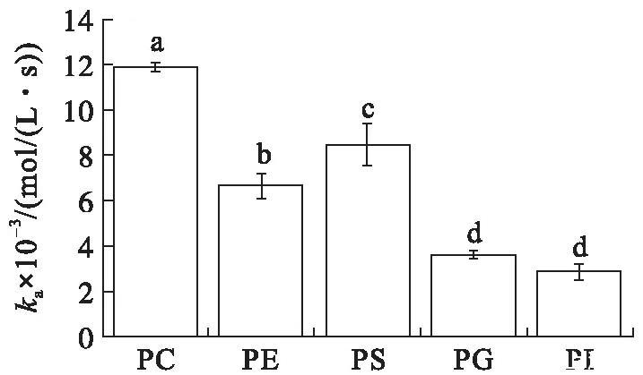 圖2初始表面壓力15 mN/m的條件下VhPLD對PC、PE、PS、PG和PI的吸附動力學(xué)參數(shù)