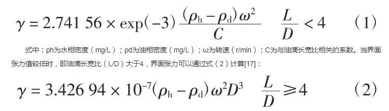 式中:ρh為水相密度(mg/L);ρd為油相密度(mg/L);ω為轉(zhuǎn)速(r/min);C為與油滴長(zhǎng)寬比相關(guān)的系數(shù)。當(dāng)界面張力值較低時(shí),即油滴長(zhǎng)寬比(L/D)大于4,界面張力可以通過(guò)式(2)計(jì)算: