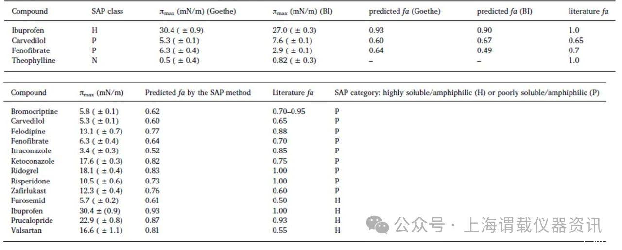 在LCs(先導(dǎo)藥物)的早期研究中,只有少量的化合物可用,如果化合物是兩親性的,SAP方法似乎是獲得fa的一個(gè)有效且快速的工具。只需要少量的LC原液的解決方案(50μl)通過Delta-8儀器進(jìn)行分析,而沒有采用進(jìn)一步分析如高效液相色譜法分析,高效液相色譜法盡管其簡(jiǎn)單,能夠預(yù)測(cè)廣泛化合物的藥物的生物利用度(fa),包括高溶性和低溶性的兩親性化合物。而對(duì)于難溶性和高溶性兩親性化合物,改進(jìn)的SAP(表面活性譜法)預(yù)測(cè)fa值與文獻(xiàn)報(bào)道的藥物分子的fa值相近。但是此方法不適合預(yù)測(cè)非兩親性藥物的fa值。