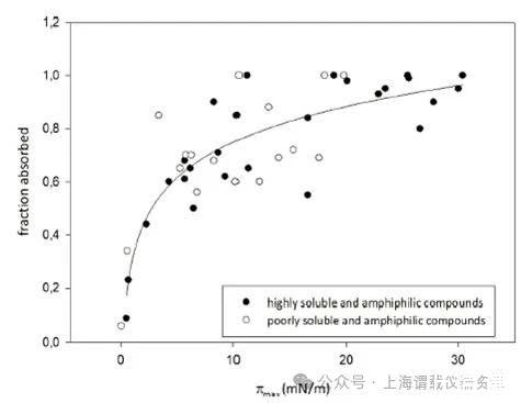 本論文研究人員提出了一種藥物活性分子生物利用度(fa)快速篩選方法-表面活性譜(SAP),作為替代傳統(tǒng)的動(dòng)物研究和細(xì)胞培養(yǎng)篩選。研究人員使用SAP技術(shù),主要是基于Kibron公司的高通量表面張力分析儀----(Delta-8),該儀器只需要50ul原液就能進(jìn)行完整的滲透率分析。并將溶液中化合物的表面活性譜化合物與生物膜相互作用或穿透生物膜的潛力聯(lián)系起來(lái)。用于這種關(guān)聯(lián)的進(jìn)一步參數(shù)包括臨界膠束濃度(CMC)、界面空氣/水分配系數(shù)(KAW?1)和分子在界面的面積要求,即截面面積(AS)等這些表面活性參數(shù)來(lái)獲取藥物的生物利用度(fa值)。此方法的提出對(duì)于先導(dǎo)化合物的早期篩選研究,因?yàn)橄葘?dǎo)化合物只有少量的化合物可用,SAP方法似乎是一個(gè)很有效和快速的工具,可以準(zhǔn)確預(yù)測(cè)兩親性化合物的fa值,為新藥研發(fā)提供了重要的技術(shù)支持,這也說明高通量的表面張力分析儀(delta-8)在藥物研發(fā)方面發(fā)揮了重要的作用,尤其是預(yù)測(cè)活性藥物分子的生物利用度(fa)提供了一種新的技術(shù)手段。