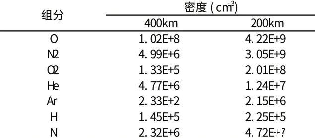 眾所周知,低地球軌道氣體主要成分是原子氧,占地軌道氣體總數(shù)的80%以上,而超低軌氣體環(huán)境與低軌有很大不同,其成分主要是分子氮(N)和原子氧(O)。表1給出了不同軌道高度下大氣組分密度的變化,從表中明顯看出,在400 km軌道,原子氧(O)的密度為1.0E+8 cm-3,比分子氮(N)密度高兩個(gè)數(shù)量級(jí)4.99E+6 cm-3;而在00 km軌道,原子氧(O)的密度為4.E+9 cm-3,分子氮(N)密度與其在同一數(shù)量級(jí)3.05E+9 cm-3。