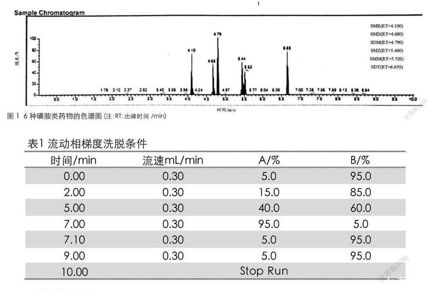 6種磺胺類標(biāo)準(zhǔn)物質(zhì):磺胺甲惡唑(SMZ)、磺胺甲基嘧啶(SMR)、磺胺間二甲氧嘧啶(SDM)、磺胺間甲氧嘧啶(SMM)、磺胺對(duì)甲氧嘧啶(SMD)、磺胺地索辛(SDT)(純度均大于99.5%,北京振翔科技有限公司);乙腈(色譜純,德國(guó)Merck公司);甲酸(色譜純,上海安普實(shí)驗(yàn)科技有限公司)。
