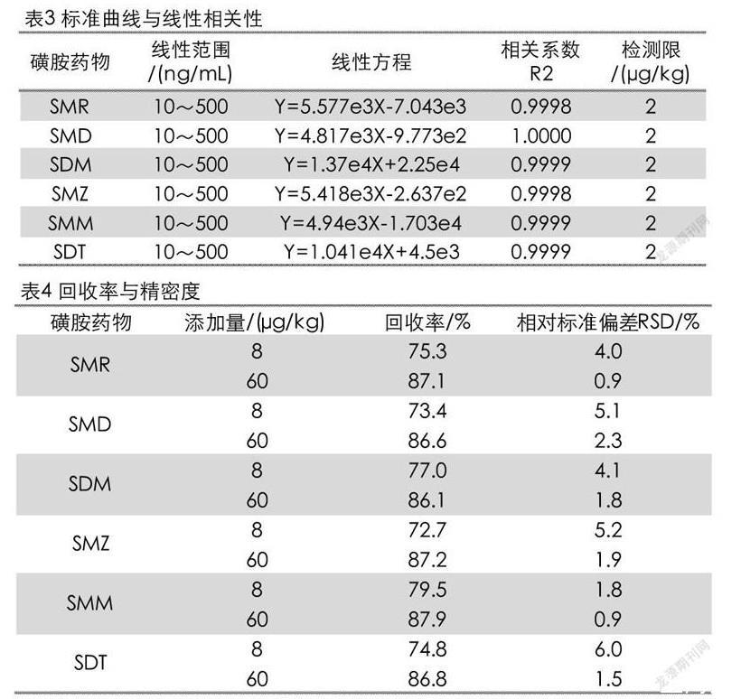 制備混合標(biāo)準(zhǔn)濃度系列,分別為10、50、100、250和500 ng/mL(分別相當(dāng)于被測(cè)組分的含量為2、10、20、50和100μg/kg)。將標(biāo)準(zhǔn)工作液按照2.3.3的方法進(jìn)樣測(cè)試。以進(jìn)樣濃度為橫坐標(biāo),以峰面積的響應(yīng)值為縱坐標(biāo)繪制標(biāo)準(zhǔn)曲線,結(jié)果如表3所。6種磺胺類藥物在濃度10~500 ng/mL范圍內(nèi)線性關(guān)系很好,相關(guān)系數(shù)R2≥0.9998。