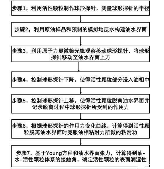 步驟7,利用界面張力儀測(cè)量油相與水相之間的界面張力,基于Young方程,結(jié)合球形探針的半徑以及球形探針的下降高度,計(jì)算得到油-水-活性顆粒體系的接觸角,確定活性顆粒的表面潤(rùn)濕性。