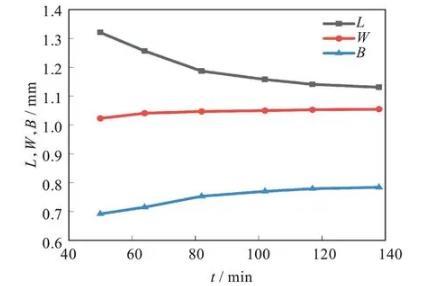 圖7為數(shù)值仿真過程中液滴三軸隨時(shí)間演化規(guī)律。綜合對比圖4和圖7,數(shù)值仿真軟件與實(shí)驗(yàn)過程中球形液滴的三軸長度變化趨勢基本一致??梢钥闯?,在體積保持不變的假設(shè)下,球形液滴的第二半軸和第三半軸變形頻帶是不一致的。該結(jié)果表明一些黏彈性液滴的變形和收縮不嚴(yán)格符合仿射變形假設(shè)(即第三半軸W始終等于第二半軸B),這與文獻(xiàn)結(jié)果類似。數(shù)值仿真結(jié)果中液滴最終形態(tài)不是一個(gè)三軸長度相等的球形,主要原因是仿真過程中使用的非牛頓流體的本構(gòu)模型只對黏性項(xiàng)進(jìn)行了修改,而忽視了彈性應(yīng)力的影響,因此與理論計(jì)算結(jié)果有一定誤差。
