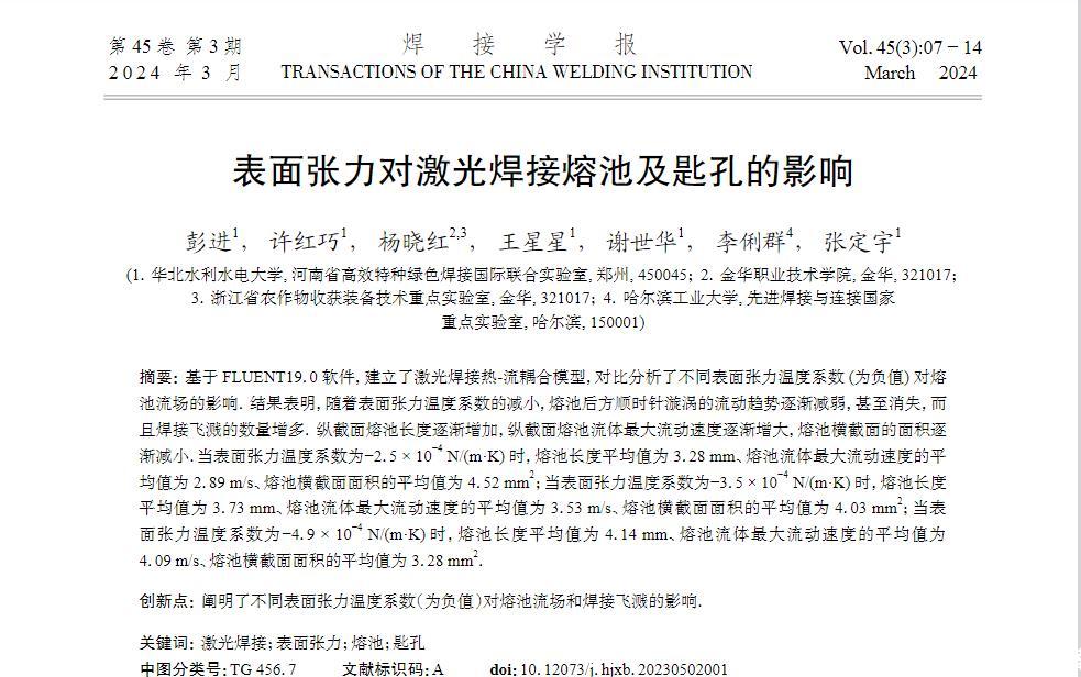 基于FLUENT19.0軟件,建立了激光焊接熱-流耦合模型,對比分析了不同表面張力溫度系數(shù)(為負(fù)值)對熔池流場的影響。