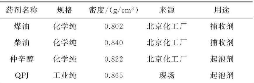 浮選藥劑有煤油、柴油、仲辛醇和QPJ,其基本性質(zhì)及用途見(jiàn)表1。