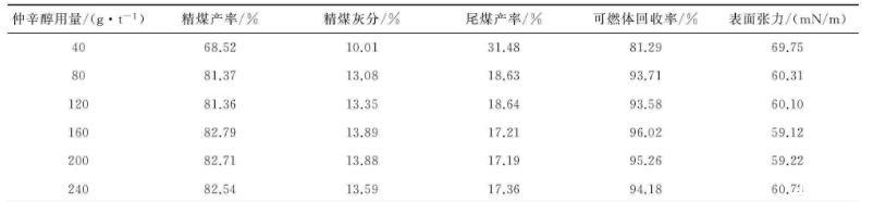 固定煤油(捕收劑)用量為800g/t,改變仲辛醇(起泡劑)用量,進(jìn)行浮選、表面張力試驗(yàn),結(jié)果見(jiàn)表3。