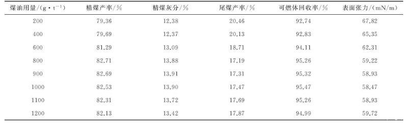 固定仲辛醇(起泡劑)用量為200 g/t,改變煤油(捕收劑)用量,同步進(jìn)行浮選和表面張力試驗(yàn),結(jié)果見(jiàn)表2。