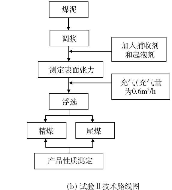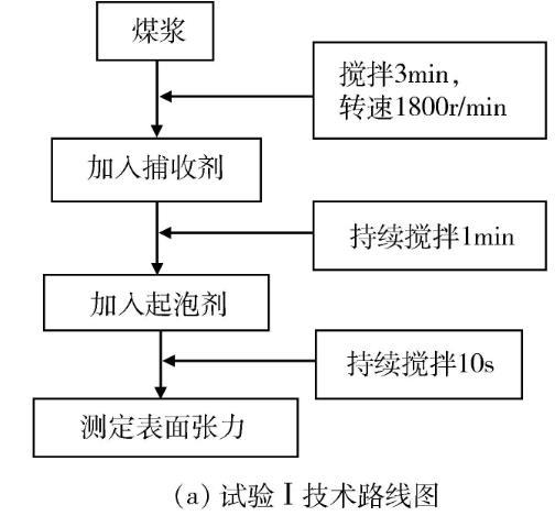 試驗(yàn)分為試驗(yàn)Ⅰ和試驗(yàn)Ⅱ兩部分。在試驗(yàn)Ⅰ中,先后改變捕收劑和起泡劑用量,對(duì)添加浮選藥劑后煤漿的表面張力進(jìn)行測(cè)定,以研究浮選藥劑用量對(duì)煤漿表面張力影響的規(guī)律。在試驗(yàn)Ⅱ中選用煤油/仲辛醇做捕收劑/起泡劑,先后改變煤油和仲辛醇的用量,按照《GB/T 4757-2013煤粉(泥)實(shí)驗(yàn)室單元浮選試驗(yàn)方法》對(duì)馬蘭2#煤泥進(jìn)行浮選試驗(yàn),并在浮選充氣前對(duì)煤漿同步進(jìn)行表面張力的測(cè)定,進(jìn)一步對(duì)浮選過(guò)程中浮選藥劑量、煤漿表面張力及浮選效果之間的關(guān)系進(jìn)行探索。試驗(yàn)控制煤漿濃度為100 g/L,溫度為22±0.2℃;使用一次去離子水(pH值為7.0±0.2)。試驗(yàn)技術(shù)路線見(jiàn)圖1。