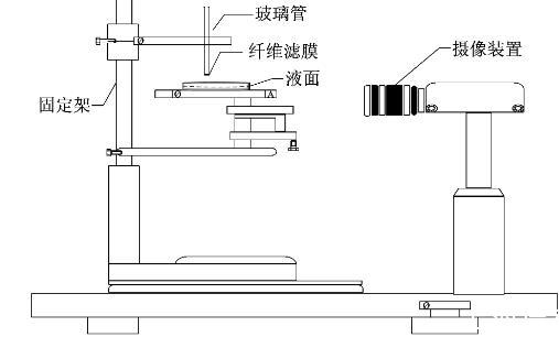 研究礦塵濕潤性能的裝置有很多,根據(jù)實際出發(fā),試驗采用毛細管反向滲透法實驗裝置。(1)本實驗選用的玻璃管長度為200 mm,內徑為4 mm,給每個玻璃管劃好刻度,其下端用纖維濾膜密封;(2)用分度值為0.1 mg的光學讀數(shù)分析天平稱取1.5 g的礦塵裝入干燥過后的玻璃管中,為提高精度,每次初填至60 mm,然后振實;(3)將玻璃管固定在固定臺上,盛有濕潤劑溶液(約20 mL)的玻璃皿置于載物臺上,旋轉載物臺,使玻璃管底部與溶液表面接觸;(4)當液面透過濾膜后,打開錄像設備記錄反向滲透到20,30,40 mm所需時間,同時記錄3 min后玻璃管的增重作為吸濕量。每種溶液對礦塵做3次試驗,取平均值。實驗裝置如圖1所示。