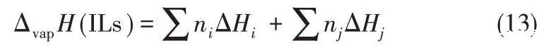 2008年,Verevkin[71]開發(fā)了一種基于經(jīng)驗公式的簡單相加法來計算ILs的蒸發(fā)焓,該焓被分解為構(gòu)成元素的主要成分和輔助成分的校正(基于結(jié)構(gòu)上的特殊性,例如CF3基團或環(huán)狀結(jié)構(gòu)的存在)
