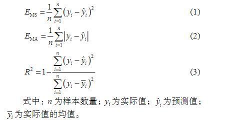 按照8∶2的比例將實驗數(shù)據(jù)劃分為訓練集和測試集,對每個模型進行訓練,并在測試集上進行驗證。這里選用3種常用于回歸任務的評價指標:均方誤差(MSE)、平均絕對誤差(MAE)和決定系數(shù)(2)。MSE和MAE可以衡量預測值與真實值之間的誤差,數(shù)值越小表示模型預測的越準確;2度量模型擬合數(shù)據(jù)的程度,取值范圍在0到1之間,越接近1表示模型對數(shù)據(jù)的擬合程度越好。這3個評價指標的計算公式如下所示: