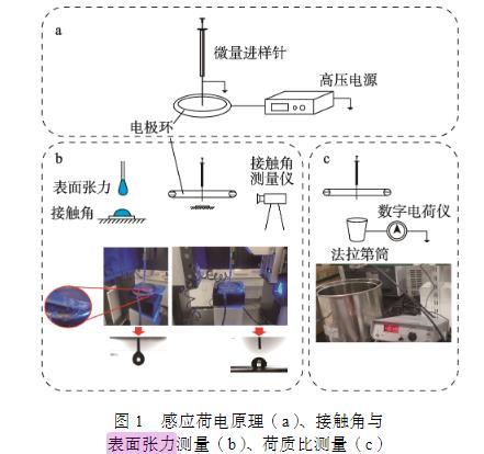 圖1感應荷電原理(a)、接觸角與表面張力測量(b)、荷質(zhì)比測量(c)