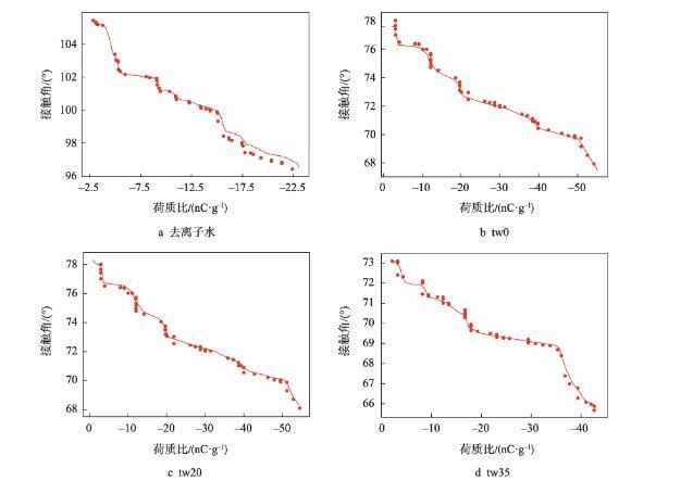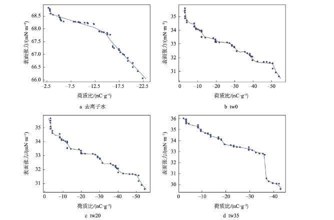 隨著膜液中吐溫20的減少和司盤20的增多,明膠液滴荷質(zhì)比亦呈增高趨勢(shì)(<0.05)。張建桃等[13]研究表明,介質(zhì)的電導(dǎo)率改變會(huì)引起其荷電性能的改變。相同質(zhì)量濃度下司盤20的物質(zhì)的量濃度更高,導(dǎo)致溶液電導(dǎo)率及液滴荷質(zhì)比增加更為明顯。然而,與只添加吐溫20的明膠溶液(tw100)相比,少量司盤20的添加(tw80)還會(huì)引起荷質(zhì)比的顯著減少(<0.05),推測(cè)這是由于溶液中吐溫20與司盤20分子通過“經(jīng)典疏水作用”在水溶液中優(yōu)先結(jié)合,從而使溶液中總?cè)苜|(zhì)相對(duì)濃度下降導(dǎo)致[14]。