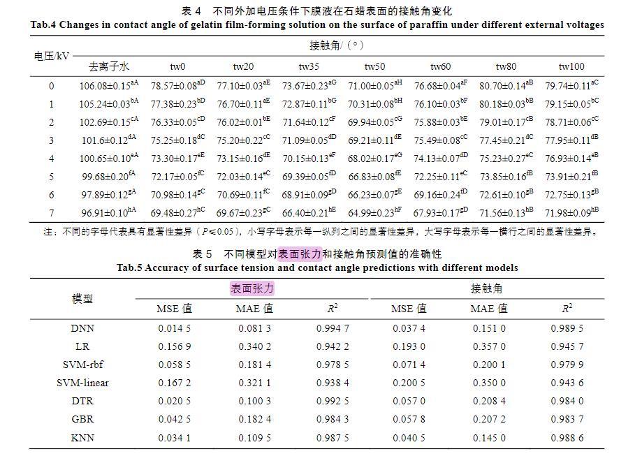 本文探究了在不同電源電壓下通過感應(yīng)荷電的方式對(duì)明膠液滴荷質(zhì)比、表面張力及接觸角的影響,并通過深度神經(jīng)網(wǎng)絡(luò)建立模型預(yù)測(cè)。結(jié)果發(fā)現(xiàn),靜電荷電能有效提高明膠液滴的潤(rùn)濕性能,當(dāng)外加電壓為7 kV時(shí),明膠成膜液滴的表面張力可以下降9%~14%,接觸角能夠下降8%~12%。從而為形成更均勻、更完整的可食性涂膜提供新的手段。在明膠的質(zhì)量分?jǐn)?shù)為3%、表面活性劑的質(zhì)量分?jǐn)?shù)為0.05%、吐溫20與司盤20濃度比為1∶1、電壓為0~7 kV時(shí),深度神經(jīng)網(wǎng)絡(luò)模型對(duì)膜液荷質(zhì)比與表面張力或接觸角的關(guān)系具有良好的預(yù)測(cè)作用,可用于指導(dǎo)實(shí)踐操作。