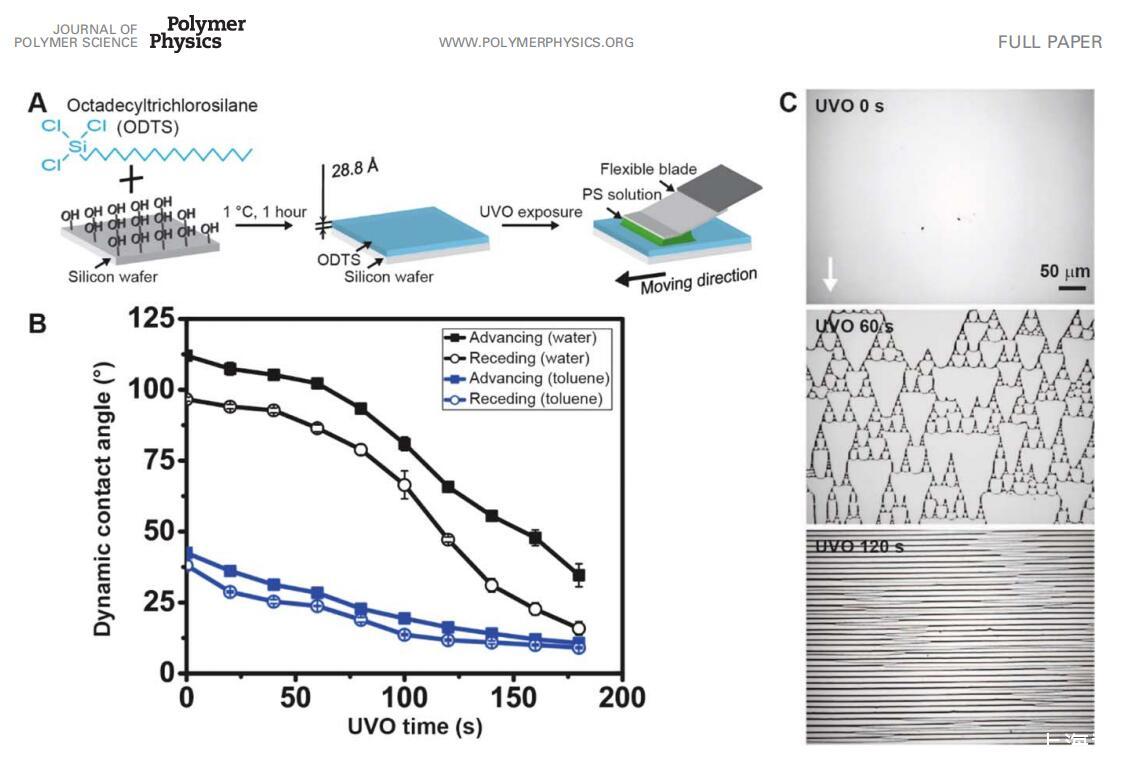 圖 1 (A) 制備具有可調(diào)表面能的基材然后應(yīng)用流涂工藝的示意圖。 (B) 動(dòng)態(tài) 接觸角包括作為 UVO 時(shí)間函數(shù)的基材的前進(jìn)(實(shí)心數(shù)據(jù)點(diǎn))和后退(開放數(shù)據(jù)點(diǎn))。 使用水(黑色數(shù)據(jù)點(diǎn))和甲苯(藍(lán)色數(shù)據(jù)點(diǎn))的液體。 誤差棒表示三個(gè)的標(biāo)準(zhǔn)偏差 獨(dú)立樣本。 (C) 在具有可調(diào)表面能的基材上制造的結(jié)構(gòu),從無(wú)沉積、超支化結(jié)構(gòu)到通過(guò)流涂的水平線。 此處使用的其他流涂參數(shù)是初始濃度 co,如 0.5 mg/mL,停止時(shí)間 t 為 100 ms,設(shè)置距離 d 為 5 lm。