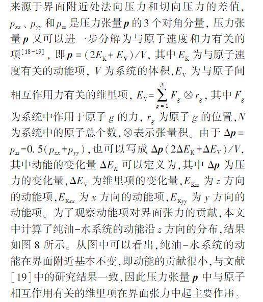在界面張力的模擬計算公式(5)中,界面張力來源于界面附近處法向壓力和切向壓力的差值,pxx、pyy和pzz是壓力張量p的3個對角分量,壓力張量p又可以進(jìn)一步分解為與原子速度和力有關(guān)的項,即p=(2EK+EV)/V,其中EK為與原子速度有關(guān)的動能項,V為系統(tǒng)的體積,EV為與原子間相互作用力有關(guān)的維里項,EV=∑Ng=1Fg?rg,其中Fg為系統(tǒng)中作用于原子g的力,rg為原子g的位置,N為系統(tǒng)中的原子總個數(shù),?表示張量積。由于Δp=pzz-0.5(pxx+pyy),也可以寫成Δp(2ΔEK+ΔEV)/V,其中動能的變化量ΔEK可以定義為,其中Δp為壓力的變化量,ΔEV為維里項的變化量,EKzz為z方向的動能項,EKxx為x方向的動能項,EKyy為y方向的動能項。為了觀察動能項對界面張力的貢獻(xiàn),本文中計算了純油-水系統(tǒng)的動能沿z方向的分布,結(jié)果如圖8所示。從圖中可以看出,純油-水系統(tǒng)的動能在界面附近基本不變,即動能的貢獻(xiàn)很小,與文獻(xiàn)中的研究結(jié)果一致,因此壓力張量p中與原子相互作用有關(guān)的維里項在界面張力中起主要作用。因為壓力張量中的動能項對壓力影響很小。