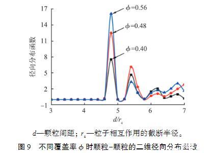 圖9不同覆蓋率?時顆粒-顆粒的二維徑向分布函數(shù)為了研究界面顆粒覆蓋率對界面張力的影響,建立了底面邊長為30rc、高度為40rc的正方體模擬區(qū)域來容納更多的顆粒,分別將不同數(shù)量的顆粒隨機(jī)放置于界面上,并采用2種方法計算不同顆粒覆蓋率下的界面張力。