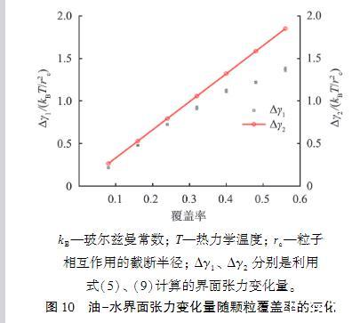 圖10油-水界面張力變化量隨顆粒覆蓋率的變化第二種方法是考慮所有因素對界面張力的影響,利用式(5)計算界面張力的變化Δγ1,如圖10中的黑點所示,黑點中的誤差棒是獨(dú)立計算多次結(jié)果得到的誤差。隨著顆粒覆蓋率的增加,界面張力降幅增大。Δγ1和Δγ2的變化趨勢是一致的,都是隨著界面覆蓋率的增大,界面張力降幅增大。在覆蓋率較小時,由于顆粒數(shù)量較少,在界面分布較為稀疏,使得顆粒間相互作用不明顯,因此顆粒間相互作用對界面張力的計算沒有太大的影響,Δγ1和Δγ2變化趨勢基本一致。隨著覆蓋率的增大,Δγ2>Δγ1。由于直接利用吸附能和吸附顆粒數(shù)量計算界面張力存在明顯的局限性,因此接下來要進(jìn)一步研究顆粒間相互作用對界面張力的影響。