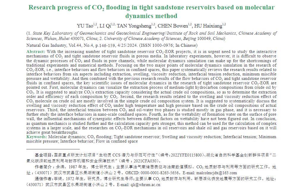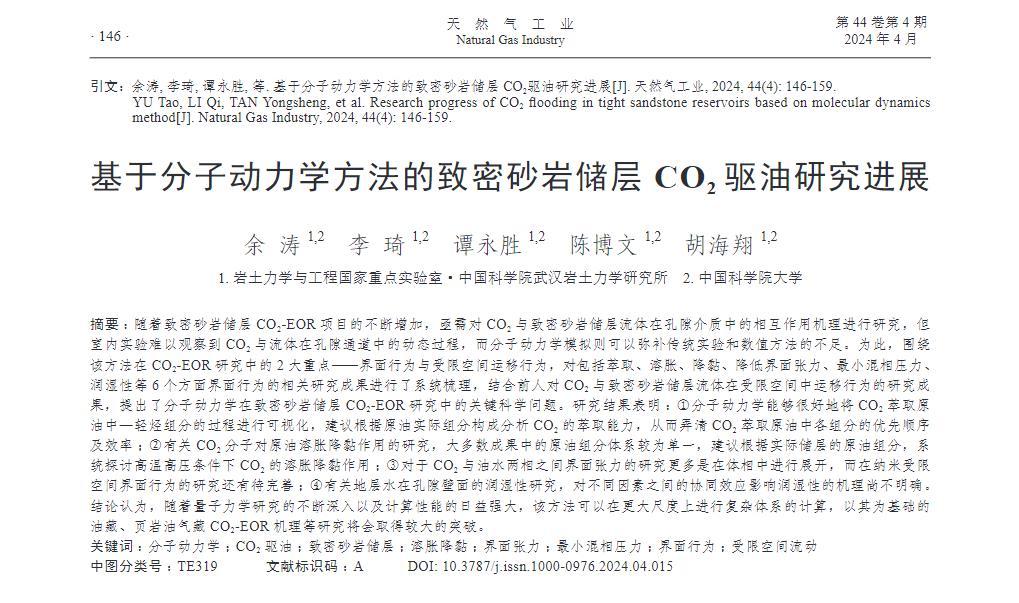 隨著致密砂巖儲層CO2-EOR項目的不斷增加,亟需對CO2與致密砂巖儲層流體在孔隙介質(zhì)中的相互作用機理進行研究,但室內(nèi)實驗難以觀察到CO2與流體在孔隙通道中的動態(tài)過程,而分子動力學模擬則可以彌補傳統(tǒng)實驗和數(shù)值方法的不足。為此,圍繞該方法在CO2-EOR研究中的2大重點——界面行為與受限空間運移行為,對包括萃取、溶脹、降黏、降低界面張力、最小混相壓力、潤濕性等6個方面界面行為的相關(guān)研究成果進行了系統(tǒng)梳理,結(jié)合前人對CO2與致密砂巖儲層流體在受限空間中運移行為的研究成果,提出了分子動力學在致密砂巖儲層CO2-EOR研究中的關(guān)鍵科學問題。