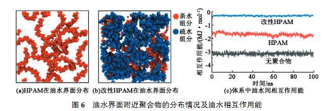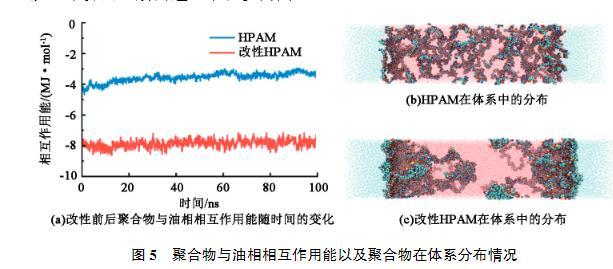 界面張力來(lái)自于界面處分子受到的應(yīng)力不均衡,因此需要增加兩相之間的聯(lián)系,從而減少界面張力。由于HPAM分子本身親水,與水相具有較強(qiáng)的相互作用,因此主要考察HPAM和油相之間的相互作用強(qiáng)度。圖5(a)為HPAM和改性HPAM與油相的相互作用能隨時(shí)間的變化??梢钥闯?,HPAM在0~100 ns的模擬過(guò)程中相互作用強(qiáng)度逐漸降低,說(shuō)明部分HPAM從油水界面處脫離進(jìn)入水相。由圖5(b)也看出HPAM分子大量均勻分布在水相中,其主要原因也是缺少親油基團(tuán),不易在界面處穩(wěn)定存在,更傾向于溶解于水中。而引入疏水基團(tuán)改性后的HPAM與油相的相互作用能明顯強(qiáng)于HPAM與油相的作用能。由圖5(c)看出改性HPAM大多數(shù)分布在油水界面附近。改性HPAM在界面處橋接了油相與水相,緩解了界面處分子應(yīng)力不均衡,從而起到降低界面張力的效果。