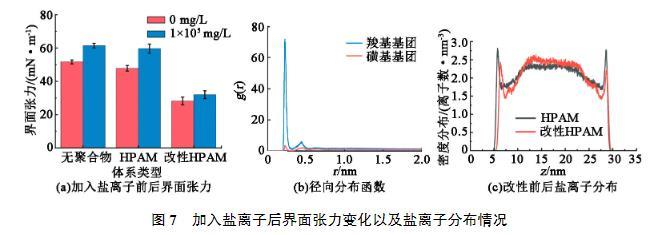 部分儲(chǔ)層中存在較高的礦化度,為此進(jìn)一步研究鹽離子對(duì)界面張力的影響。在3個(gè)體系的水相中分別加入質(zhì)量濃度為100 g/L的NaCl,觀察其對(duì)界面張力的影響情況,結(jié)果見(jiàn)圖7(a)??梢钥闯?,對(duì)于沒(méi)有聚合物存在的體系中,界面張力會(huì)隨著鹽離子的增加而增大。這是由于鹽離子的存在增大了水相的極性,從而拉大了油水兩相性質(zhì)上的差距,增大了油水界面張力。因此當(dāng)界面處的鹽離子增多時(shí),界面張力則會(huì)增大。加入HPAM的體系中也出現(xiàn)了類(lèi)似的情況。然而引入磺酸基團(tuán)改性后的HPAM則受鹽離子的影響較小。為了解釋這一現(xiàn)象的物理機(jī)制,分析了帶電基團(tuán)周?chē)鶱a+分布(圖7(b))。通過(guò)計(jì)算徑向分布函數(shù)g(r),發(fā)現(xiàn)羧酸基團(tuán)周?chē)溯^多的Na+,導(dǎo)致Na+在聚合物附近聚集,而改性引入的磺酸基團(tuán)具有一定的抗鹽作用,其周?chē)植嫉腘a+數(shù)量更少。這也就導(dǎo)致2種體系界面附近Na+密度不同(圖7(c))。由于HPAM含有較多的羧酸基團(tuán),會(huì)引起Na+在聚合物附近的富集,導(dǎo)致界面張力的增加。而在加入改性HPAM后,引入的磺酸基團(tuán)對(duì)Na+的吸引力較弱,導(dǎo)致界面附近的Na+和改性前相比有明顯的減少,界面張力增加較少。因此加入磺化改性的HPAM在高礦化度下仍然可以保持較高的界面活性。