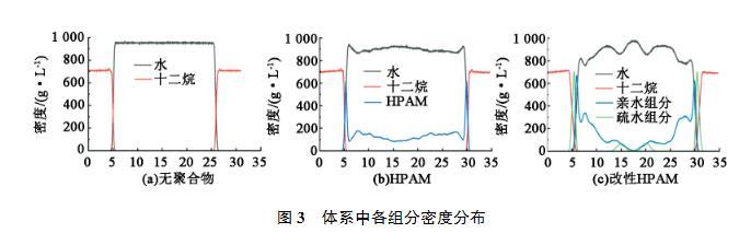 聚合物改變油水界面張力的本質(zhì)是油水界面特征的改變,為此分析各個(gè)組分在體系中的密度分布情況,結(jié)果見(jiàn)圖3??梢钥闯觯跊](méi)有聚合物的情況下,油水界面非常清晰,油相和水相處于完全分離的狀態(tài)。加入HPAM后,油相的分布幾乎沒(méi)有變化,而界面處水相密度變化的斜率略有減少,說(shuō)明HPAM主要分布在水相中,在一定程度上減少了界面上水分子的數(shù)量。但由于HPAM和油相之間的相互作用較弱,因此并沒(méi)有改變油相在界面附近的分布情況。改性HPAM的加入對(duì)油水兩相的密度分布影響都較大,界面處油相密度變化的斜率減小,說(shuō)明親油組分和油分子相互融合,從密度分布還可以看出由于聚合物的加入,油相和水相被聚合物顯著分離。