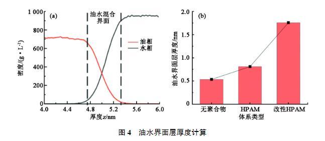 界面層厚度能夠反映油水界面處兩相的混合情況,一般來(lái)說(shuō)界面厚度越大說(shuō)明兩相之間的排斥越小,互溶效果越好,界面張力越低。參考Ricardo Paredes等的方法,選取密度低于油和水密度峰值90%的區(qū)域作為油水混合界面,如圖4(a)所示。計(jì)算得到的界面層厚度見(jiàn)圖4(b)??梢园l(fā)現(xiàn),加入HPAM對(duì)于界面層影響很小,改性HPAM的加入可以大幅提高油水界面層厚度。這也反映出未改性HPAM油水界面依然比較清晰,兩相界限明顯,界面處油分子和水分子受力不均勻的現(xiàn)象依然嚴(yán)重;改性HPAM疏水基團(tuán)進(jìn)入油相中,引起z方向油水分布重疊區(qū)域變大,油水界面區(qū)域擴(kuò)展,油水界面變得凹凸不平,油水相的“螯合”加強(qiáng),界面處分子受力不均衡得到了緩解,有利于界面張力降低。