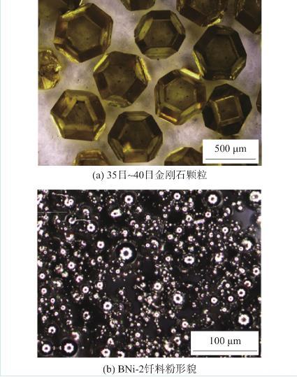 金剛石磨粒的抗壓和耐磨性能與其自身品級有關(guān),精選河南黃河旋風(fēng)股份有限公司晶形完整、強韌度好、無缺陷的高品級HSD90型人造金剛石,圖1為金剛石和BNi-2釬料粉的形貌,其中金剛石的原始形貌如圖1a所示,所用粒度為35目——40目。釬涂試驗前,利用角磨機或噴砂機清理基材表面,然后利用丙酮進行超聲波清洗30 min,以避免試驗過程雜質(zhì)干擾,保證金剛石磨粒的透光性。釬涂試驗基材為65Mn鋼,激光釬涂試樣尺寸為200 mm×100 mm×10 mm.釬料合金既要潤濕金剛石和鋼基材,形成冶金結(jié)合,又要兼顧耐磨性,與涂層硬質(zhì)顆粒耐磨性能匹配。選用釬料合金為200目NiCrSiB(Ni82Cr7Si4.5B3.1Fe3,后文簡稱BNi-2)釬料,形貌如圖1b所示。BNi-2釬料具有耐磨性好、成本低等優(yōu)點,合金中Cr元素可大幅提高釬料/金剛石界面結(jié)合強度,B元素和Si元素的添加降低了釬料熔點,有助于減少金剛石熱損傷。