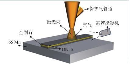 前期開展了激光釬涂金剛石技術(shù)研究,分析了激光功率和掃描速率對涂層微觀組織與力學(xué)性能的影響。從現(xiàn)有研究來看,已有的激光釬涂金剛石研究大多數(shù)集中于金剛石/釬料合金界面的組織演變和單層金剛石工具的機械加工性能方面,在釬涂層的成形過程方面尚未進行深入的研究工作。前期研究發(fā)現(xiàn),在激光釬涂金剛石過程中,金剛石易于向表面聚集,這對涂層的整體性能提升將會產(chǎn)生極大的影響,因此需要針對涂層的成形行為及其機理方面進行深入的研究,進一步提升涂層的耐磨性能。文中采用BNi-2合金作為釬料,利用光纖激光在65Mn鋼基體上制備金剛石涂層,并利用高速攝影技術(shù)觀察金剛石激光釬涂過程中,鎳基粉末形成涂層和金剛石遷移全過程,分析釬涂層的成形行為及其機理,并討論激光釬涂金剛石的能量轉(zhuǎn)換與傳遞路徑,以期為激光釬涂金剛石的工程應(yīng)用提供數(shù)據(jù)支撐。
