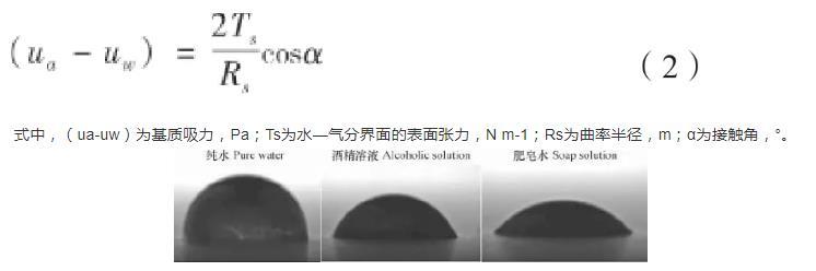 由上式可以看出,基質(zhì)吸力的大小與表面張力、接觸角和曲率半徑有關。其中,基質(zhì)吸力的大小與表面張力成正比,與彎液面曲率半徑成反比。因此,表面張力和曲率半徑的變化均會導致基質(zhì)吸力的改變。在環(huán)境溫度為25℃時,通過JC2000型接觸角測量儀對三種試樣的孔隙液體進行接觸角測量。得到三種不同表面張力液滴的幾何形態(tài)圖如圖4所示,測量可得純水、酒精溶液和肥皂水對應的接觸角分別為85°、65°和42°,而在25℃環(huán)境下,純水、20%酒精溶液、2 g L-1肥皂水的表面張力系數(shù)分別為:7.1×10-2N m-1、4.1×10-2N m-1、2.9×10-2N m-1。表面張力是決定彎液面形狀的主要因素之一,會影響曲率半徑和接觸角的大小。很顯然,表面張力大的液體接觸角變大,曲率半徑變小。圖4中水滴表面張力大于酒精溶液,但形成的彎液面半徑卻要小于酒精溶液,同樣的,酒精溶液形成的彎液面半徑又小于肥皂水。曲率半徑越小,土體中的基質(zhì)吸力越大??紫端砻鎻埩澮好娴那拾霃疆a(chǎn)生改變從而對基質(zhì)吸力產(chǎn)生影響,最終影響土壤的收縮開裂。