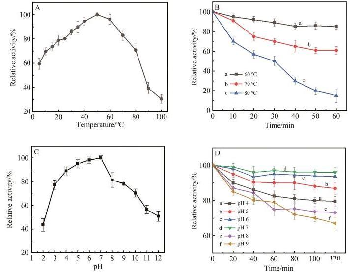 圖5溫度、pH值對(duì)β-甘露聚糖酶酶活力及穩(wěn)定性的影響