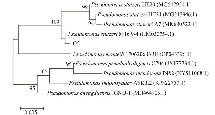 利用16S rRNA基因測(cè)序?qū)闛5進(jìn)行鑒定,將測(cè)序結(jié)果通過(guò)NCBI數(shù)據(jù)庫(kù)中的BLAST進(jìn)行比對(duì)分析,發(fā)現(xiàn)菌株O5與假單胞菌的同源性最高,為99.87%。利用MEGA軟件構(gòu)建系統(tǒng)發(fā)育樹(shù)(圖4)。由圖4可知,菌株O5和施氏假單胞菌Pseudomonas stutzeri M16-9-4位于進(jìn)化樹(shù)的同一分支中,親緣關(guān)系最相近。綜合形態(tài)特征鑒定,鑒定菌株O5為施氏假單胞菌(Pseudomonas stutzeri),命名為Pseudomonas stutzeri O5。