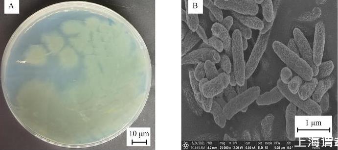 形態(tài)學(xué)鑒定如圖3所示,菌株O5在LB平板上呈灰綠色,表面光滑隆起,邊緣不整齊;革蘭氏染色鑒定為陰性;經(jīng)掃描電子顯微鏡觀察得,菌株O5為桿狀菌,菌體長(zhǎng)為1.5~2.0μm,寬為0.3~0.4μm。