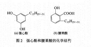 從圖1可以看出,兩種生物質(zhì)腰果酚磺酸鹽的收率隨著反應(yīng)溫度的升高先增加隨后變化較緩,而活性物含量先增大后減小。在磺化溫度為25℃時,不飽和腰果酚磺酸鹽和飽和腰果酚磺酸鹽的活性物含量達到最大值,分別為84.0%和98.7%,此時收率也較高,分別為85.0%和88.9%。當(dāng)磺化溫度高于25℃時,兩種腰果酚磺酸鹽的活性物含量降低,收率變化較小。分析原因可能為,磺化溫度太高,會導(dǎo)致過磺化,生成的副產(chǎn)物水溶性較差,導(dǎo)致活性物含量較低。在相同條件下,飽和腰果酚磺酸鹽的收率和活性物含量高于不飽和腰果酚磺酸鹽,這主要是由于不飽和腰果酚中含有一定量的雜質(zhì)強心酚和腰果酸,結(jié)構(gòu)見圖2。這兩種物質(zhì)的結(jié)構(gòu)與腰果酚的結(jié)構(gòu)相似,分離難度較大;且這兩種物質(zhì)也發(fā)生磺化反應(yīng),導(dǎo)致不飽和腰果酚磺酸鹽的活性物含量較低。然而通過對不飽和腰果酚進行側(cè)鏈加氫生成飽和腰果酚后,物理性質(zhì)發(fā)生變化,飽和腰果酚為棕色固體,強心酚和腰果酸為液體,很容易分離。因此,飽和腰果酚磺酸鹽的活性物含量高于不飽和腰果酚磺酸鹽。