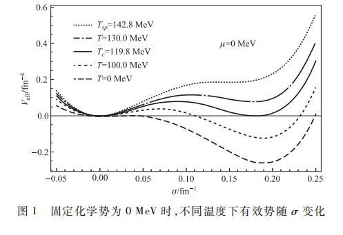 為了更加準(zhǔn)確地描述夸克-膠子等離子體(Quark-Gluon plasma,QGP)與強(qiáng)子物質(zhì)之間的相變特征,在溫度密度有限的情況下,通過嚴(yán)格的數(shù)值方法,固定化學(xué)勢為μ=0 MeV,作出如下有效勢Veff隨σ場變化的函數(shù)關(guān)系圖像。其中,由上至下曲線的溫度依次設(shè)定為T=142.8,130.0,119.8,100.0以及0 MeV.如圖所示,在溫度相對較低時(shí),每條勢能曲線都具有兩個(gè)極小值和一個(gè)極大值,一個(gè)極小值位于σ較小的σ0處,另一個(gè)極小值位于σ較大的σv處,其間存在一個(gè)局域極大值,對應(yīng)兩極小值之間存在的勢壘。